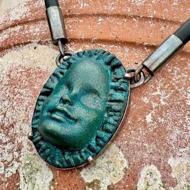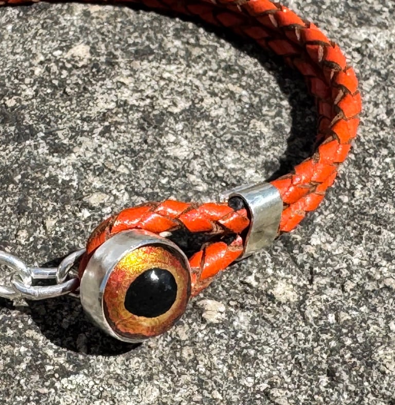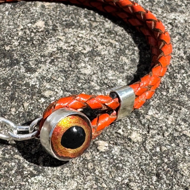Painted glass eye, leather, sterling silver